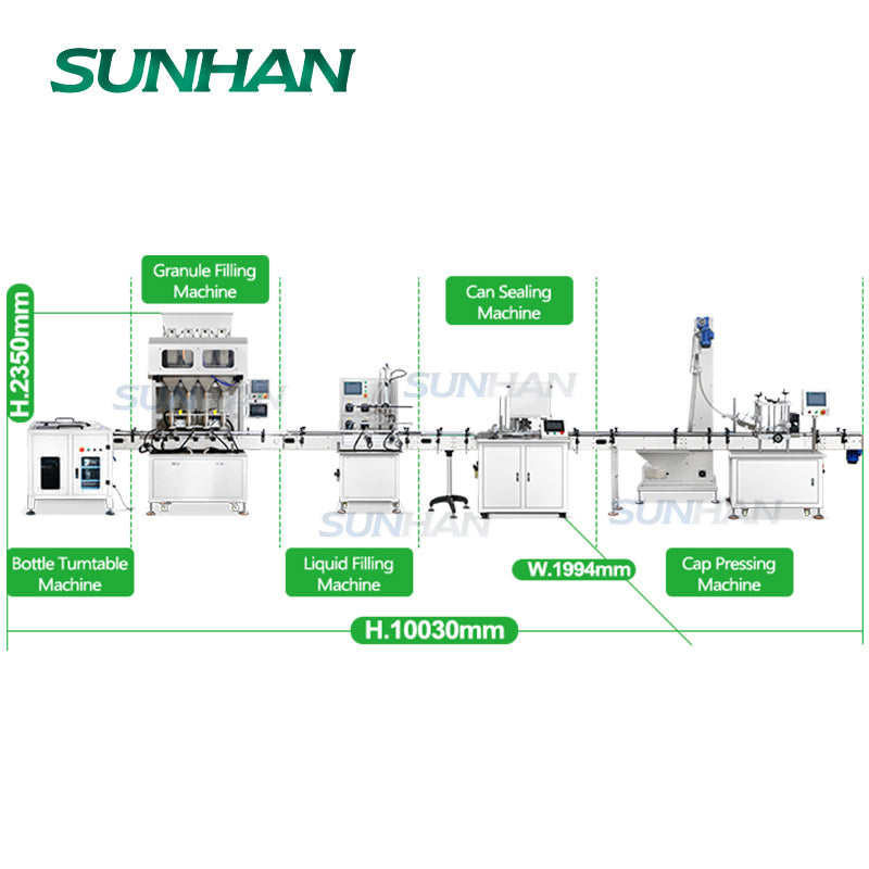 ▶Consists of a bottle turntable machine, a granule filling machine, a liquid filling machine, aluminum mesh feeding machine, a can sealing machine and a cap pressing machine.