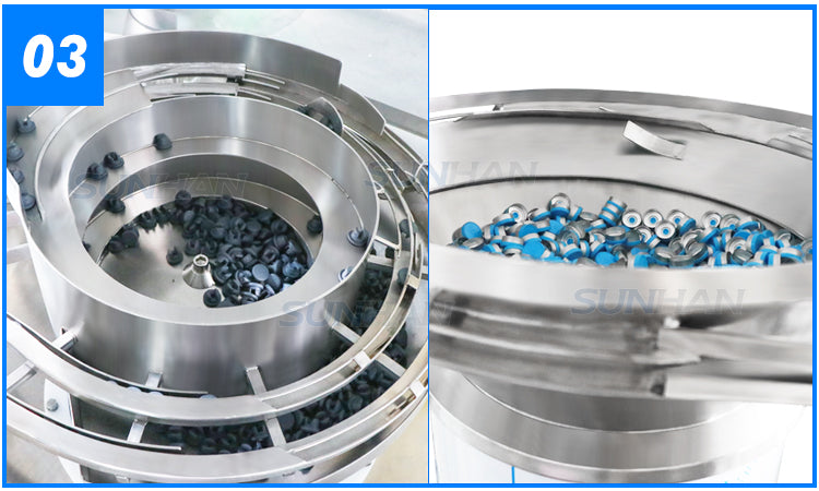 Automatically orients and feeds stoppers and caps for continuous production.