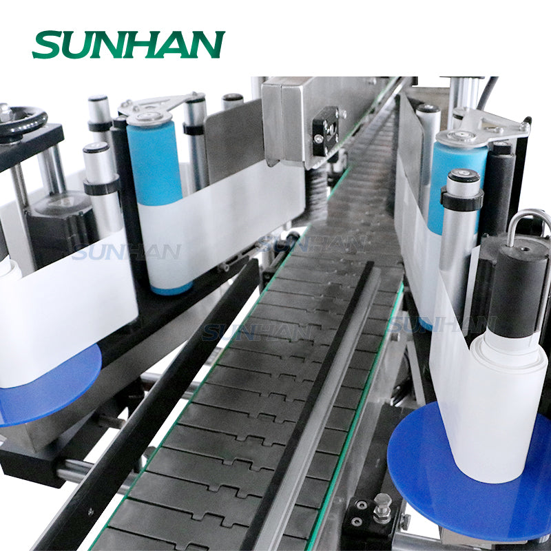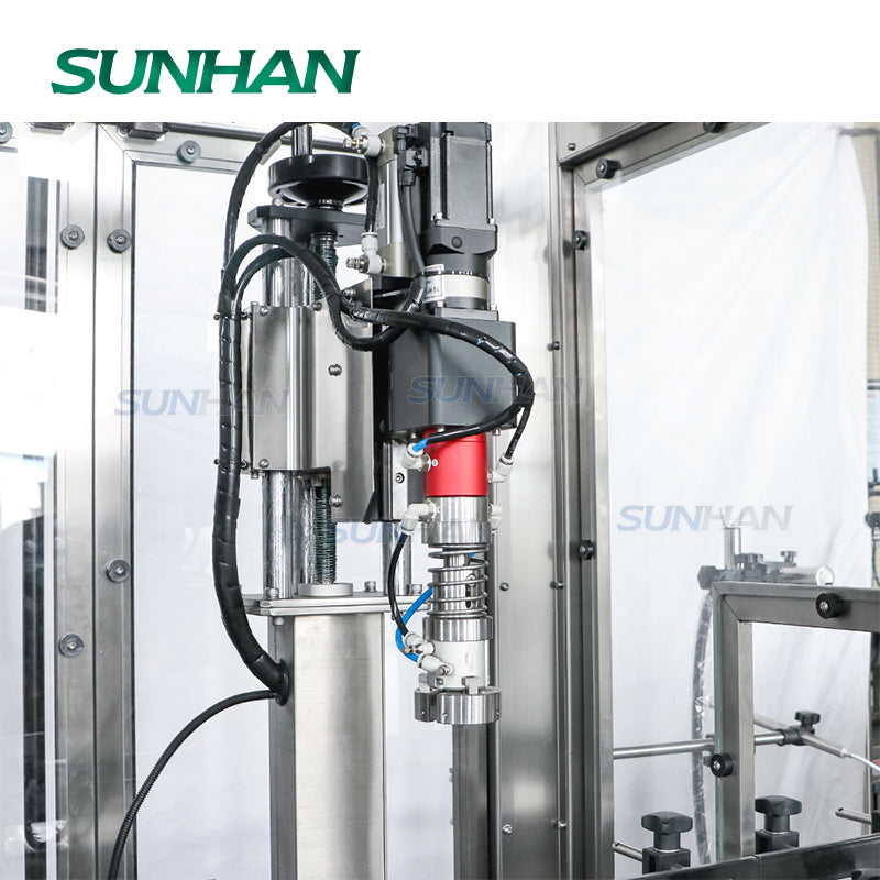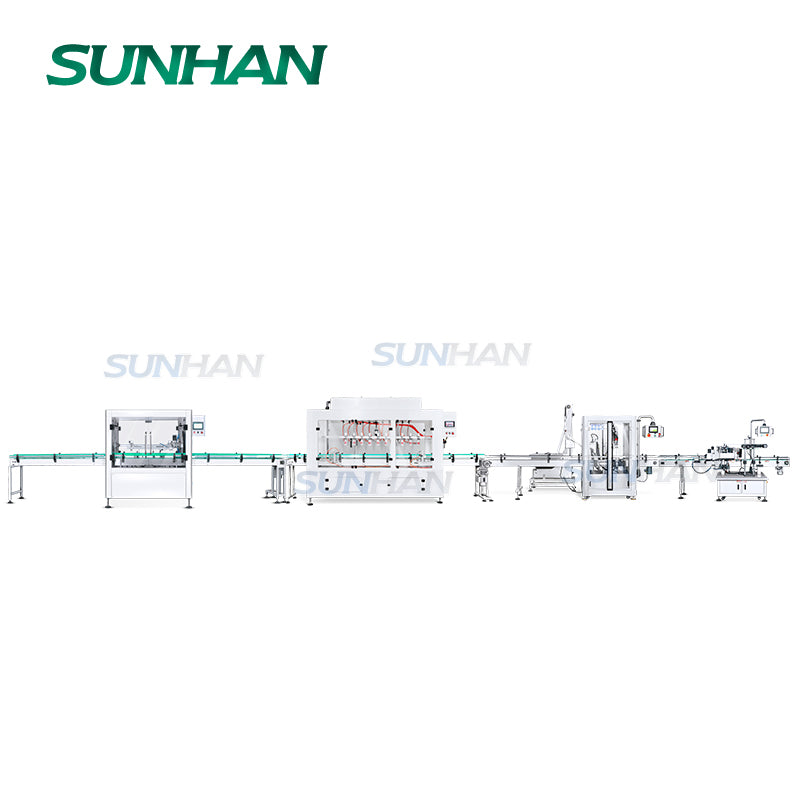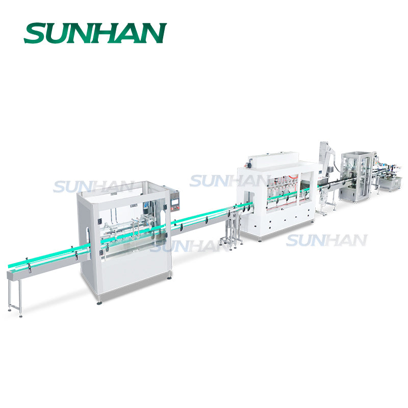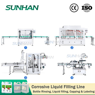 ▶Эта линия может выполнять ополаскивание бутылок, розлив едких жидкостей, укупорку и двустороннюю этикетировку на одной линии.