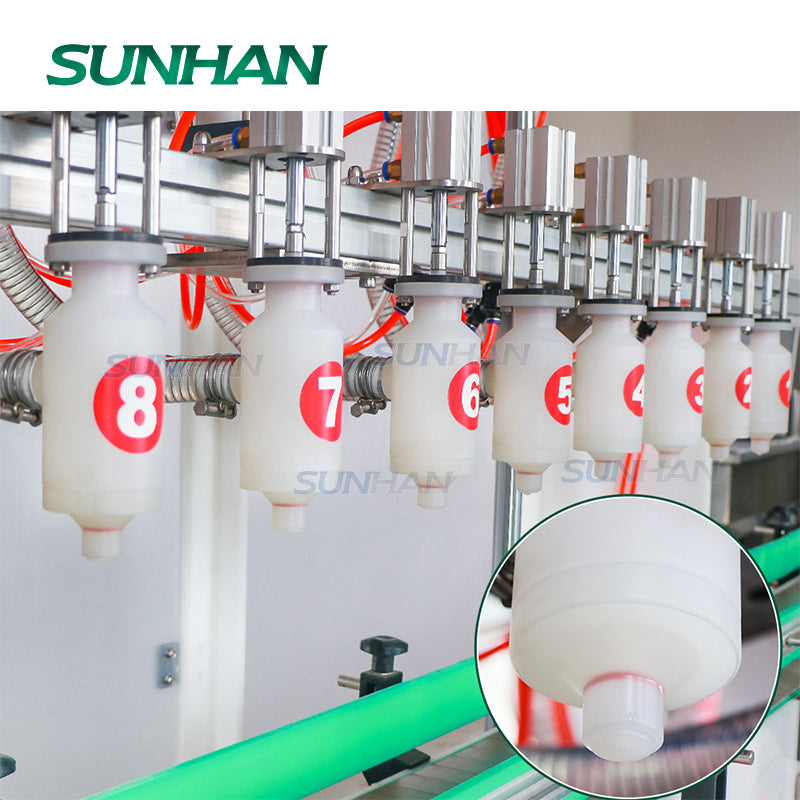 Автоматическая линия розлива едких химических жидкостей в пластиковые бутылки, канистры для туалетов с 10 головками